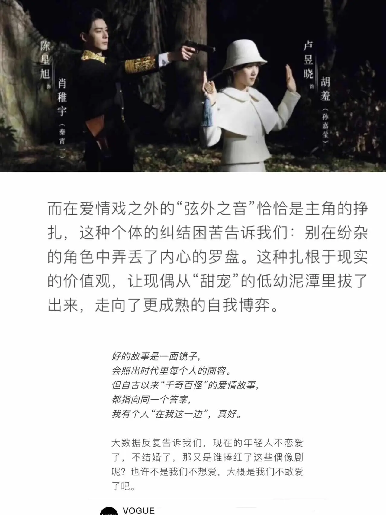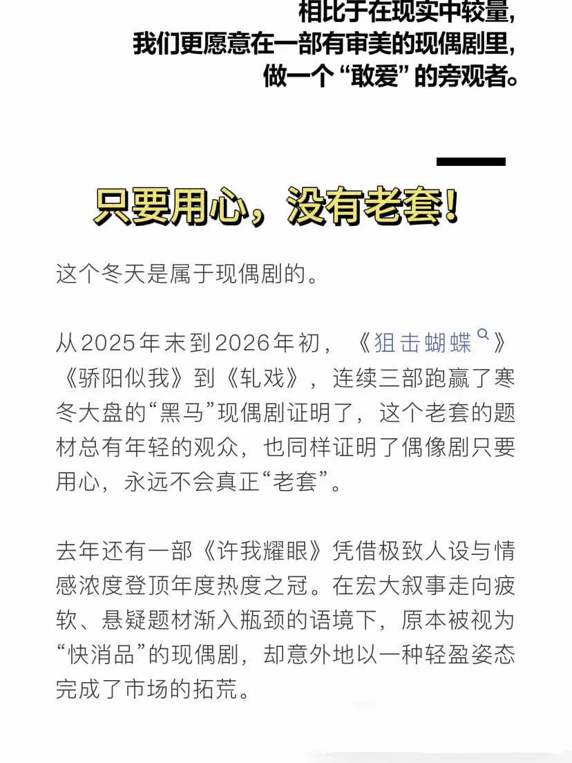 谁懂!轧戏这个大结局的含金量?#现偶[话题]# 终于不再以结婚作为终局,来叙述男女主的情感关系,而是男女主在热爱的事业的陪伴下,一直热恋,这个结局真的很美妙。 当别人还在感叹肖稚宇没有见证胡羞事业上的关键时刻时,他的回答堪称经典,“虽然可惜,但胡羞不需要谁的见证,来佐证价值,也不需要谁的观望,来赋予意义“天呐!这才是我想要看的现偶啊,女主拥有主体性,男主尊重她的主体性,设定太赞了,不愧是#vogue[话题]# 认证的黑马剧,他值得! 就像#vogue[话题]# 里说的那样,从《狙击蝴蝶》《骄阳似我》到《轧戏》,连续三部跑赢了寒冬大盘的"黑马"现偶剧,像我们证明了偶像剧只要用心,永远不会真正"老套"。 顺便赞一下轧戏这个全员上桌!我们看了代旭饰演的裴轸,终于走出了原生家庭,往后余生,他选在在原有的地基上,找寻自己的想法,开拓自己人生的无限可能,我们看到李婷婷饰演的赵孝柔,她能清醒的面对丈夫的背叛,更是用一句“我决定不在爱你了,你就什么都不是了”,向我们表达了女主之外的女性角色拥有主体性的魅力,我们更看到了任宥纶饰演的王光明,给我们演绎情感是流动的,人生起伏的真实性。 轧戏最妙一点还在于,王光明同意分开之后,就再没出现过, 赵孝柔和龚怀聪的感情线,也没有执着于一定要给他们一个结局。 越品轧戏,越品出了一点#Netflix[话题]# 精品剧的味道,而开局#剧本杀[话题]# 的设定,在#国产剧[话题]# 里更是少见,新鲜的设定,更多层次的人物内核设定,希望未来能在大屏幕上,看到柠 萌 制 作的越来越多像这样有创意的偶像剧。 #轧戏[话题]# #陈星旭[话题]# #卢昱晓[话题]# #爱情[话题]# #磕cp[话题]# #代旭[话题]# #马思超[话题]# #李婷婷[话题]# #任宥纶[话题]# #交换我的追剧repo[话题]# #轧戏追剧讨论团[话题]# #红薯地新鲜事[话题]# @热点薯