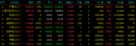 2025年12月31日,早盘开盘,国内期货主力合约涨跌不一。沪镍涨超3%,集运欧线、玻璃、液化石油气(LPG)、碳酸锂涨超2%。跌幅方面,铂跌近5%,钯跌超2%,低硫燃料油(LU)跌超1%。